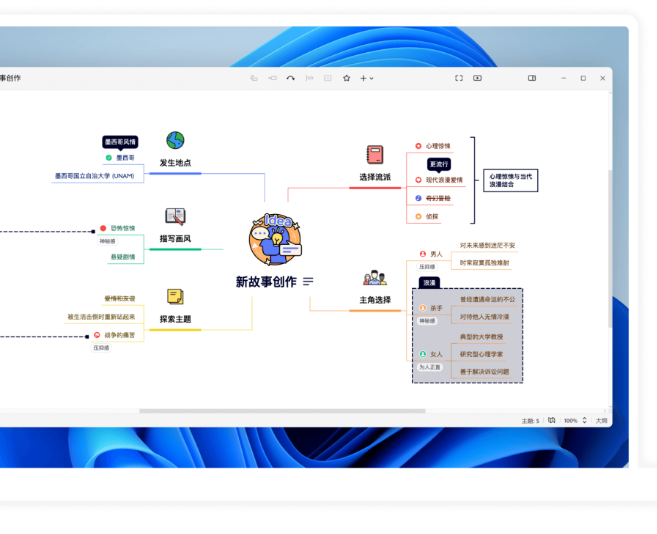 提供 9 种不同的导图结构,包括思维导图、逻辑图、括号图、树形图、组织结构图、时间轴、鱼骨图、树型表格、矩阵图,适用于工作中需要逻辑思考的各个场景。在一张导图中更可以混用不同的结构来呈现复杂的思维或项目。